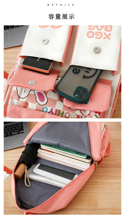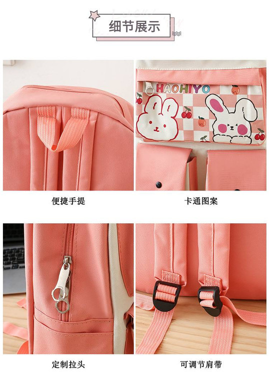 قسمت جلویی کیف با طرح چاپی خرگوشهای بامزه تزئین شده که استایل کودکانه و دلنشینی بهش میده. مناسب برای مدرسه، دانشگاه یا سفرهای کوتاه.