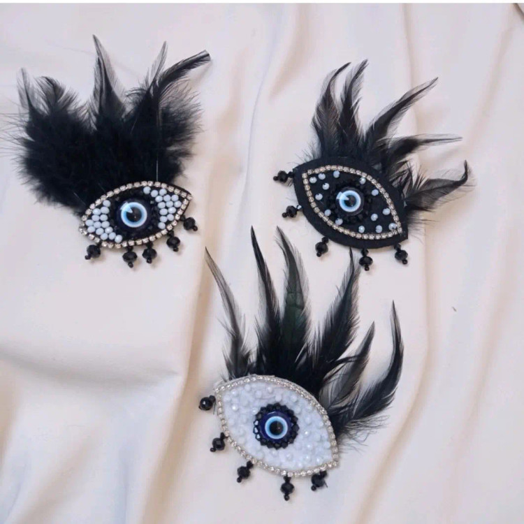 گل سینه یا سنجاق سینه دست دور کریستال و نگین پر طبیعی ابعاد چشم 8*5 ابعاد از پر حدود 15cm
